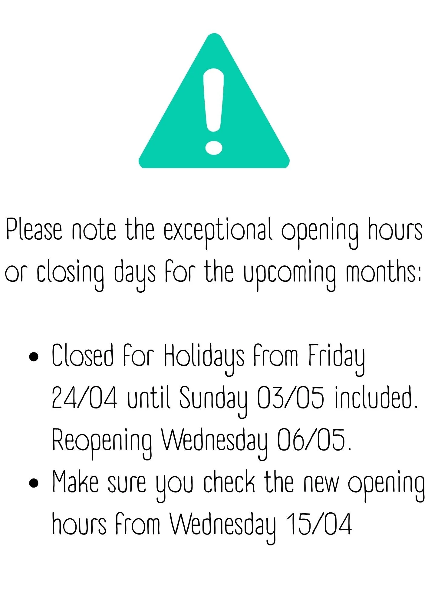 Please that we are changing our opening hours and offer from Wednesday 15/04. Opening at 12pm during the week, no Breakfast, No pastries. Evening Bistro offer from 6pm to 8pm.